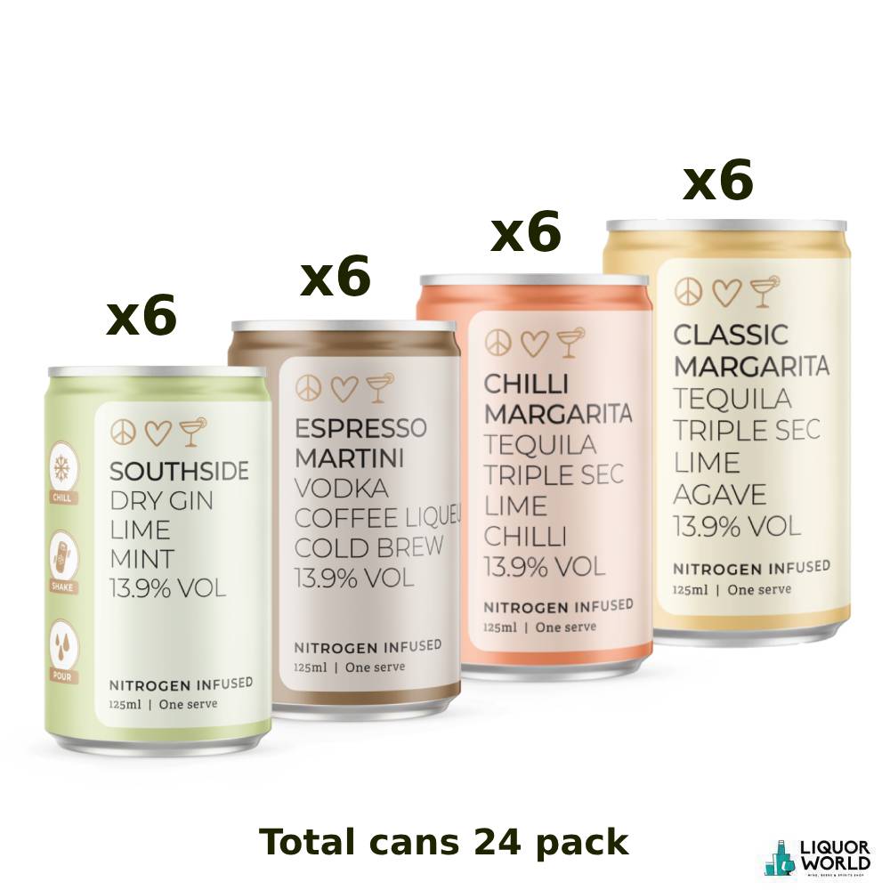 Byron Bay Spirits Ready Made Cocktails offer a premium selection of bar-quality cocktails in a convenient mixed 24-pack. Featuring four signature serves—Classic Margarita, Chilli Margarita, Espresso Martini, and Southside—each crafted with Byron Bay’s own distilled spirits and real ingredients. Bottled at a bold 13.9% ABV, these 125ml cans deliver full-flavoured cocktail experiences ready to enjoy anytime, anywhere—no shaking, stirring, or mixing required.