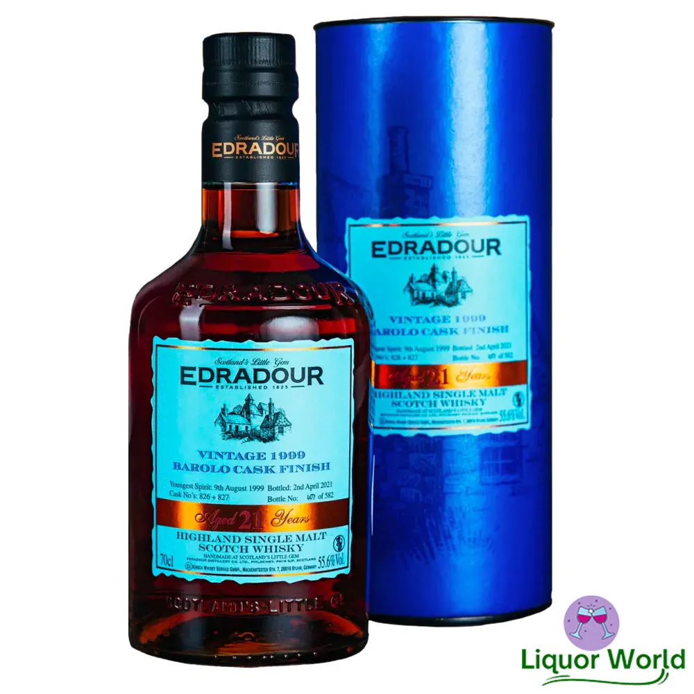 Edradour 21 Year Old 1999 Barolo Cask Finish Cask Strength Single Malt Scotch Whisky 700mL is an extraordinary and limited edition release from Edradour distillery. This whisky showcases the distillery’s commitment to craftsmanship and innovation, as it is finished in Barolo wine casks to impart unique and rich flavors.