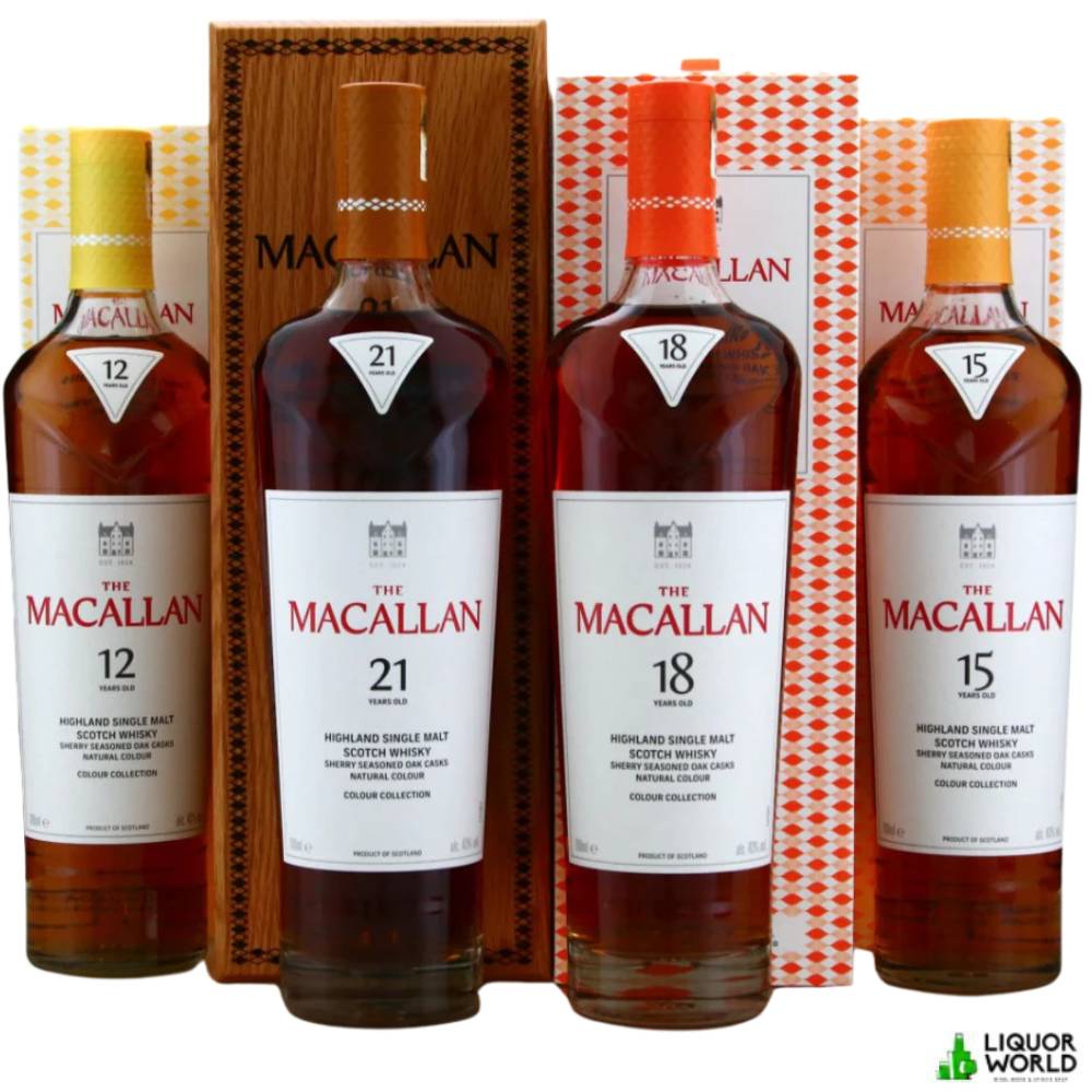 The Macallan Colour Collection 12, 15, 18 & 21 Year Old Single Malt Scotch brings together four remarkable single malt Scotch whiskies, each showcasing The Macallan’s mastery of natural colour and sherry seasoned oak maturation. From the approachable richness of the 12 Year Old to the profound depth of the 21 Year Old, this collection offers a journey through the hallmark character of The Macallan. Crafted in American and European oak sherry seasoned casks, every expression highlights a distinct stage of maturity, making this set an extraordinary collectible for whisky connoisseurs and Macallan enthusiasts alike.