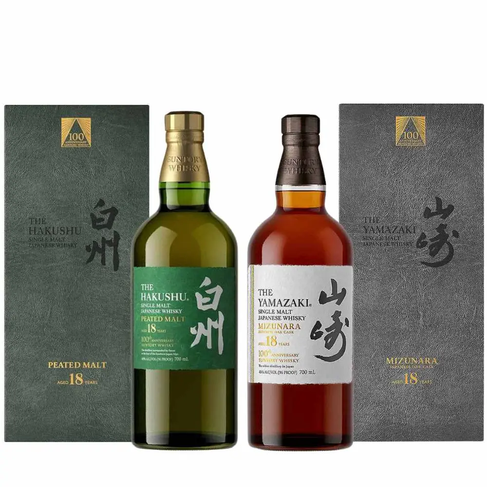 Yamazaki 18 yr Mizunara & Hakushu 18 yr Peated Malt 100TH Anniversary Edition Single Malt Japanese Whisky 700mL