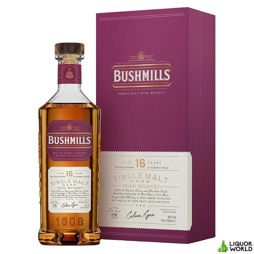 Bushmills 16 Year Old Single Malt Irish Whiskey 700mL The Bushmills 16 Year Old Single Malt Irish Whiskey is a premium, triple-distilled whiskey aged in Oloroso sherry and bourbon casks, then finished in port wine casks. This unique maturation process imparts deep, layered flavors that showcase the artistry of Bushmills' long-standing tradition in Irish whiskey. With a rich balance of fruit and spice, this expression is an indulgent choice for seasoned whiskey lovers and newcomers alike.- Brand: Bushmills