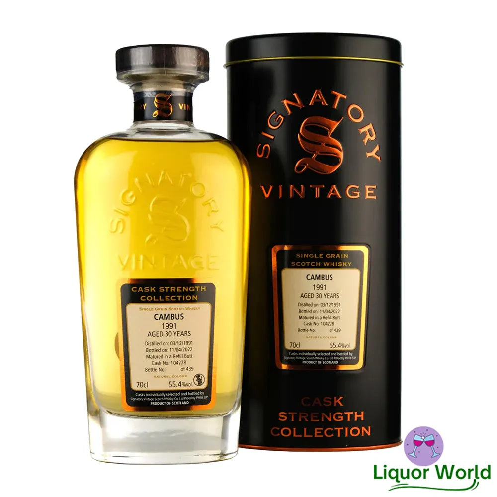 Cambus 1991 30 Year Old Cask Strength S.V Single Grain Scotch Whisky is a rare and extraordinary spirit that embodies the pinnacle of single grain whisky excellence. This 700mL bottle of Cambus represents a remarkable release, highly sought after by whisky enthusiasts and collectors alike. Distilled in 1991 and aged for an impressive 30 years, this cask strength single grain whisky showcases exceptional depth and complexity. With a robust palate of flavors including vanilla, toffee, tropical fruits, and a hint of oak, Cambus delivers an indulgent and memorable tasting experience. The exceptional quality and age of Cambus 1991 30 Year Old Cask Strength S.V make it a true connoisseur's choice. Each sip reveals layers of sophistication and craftsmanship, highlighting the meticulous maturation process and the mastery of the distillery.