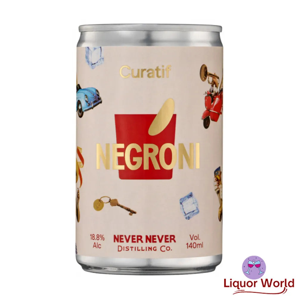 Curatif Never Never Distilling Negroni 140ml (24 Pack) The Curatif Never Never Distilling Negroni is a pre-made cocktail that comes in a 140ml can. This pack contains 24 cans. This cocktail is made with Never Never Distilling Co.'s Triple Juniper Gin, sweet vermouth, and bitter Campari, creating a perfectly balanced Negroni cocktail that is smooth, sophisticated, and full of flavor. The ingredients used in this cocktail are of the highest quality, and there are no artificial flavors, colors, or preservatives used. It has an alcohol content of 17.35% by volume, making it perfect for parties, gatherings, or any occasion where you want to enjoy a delicious cocktail without having to mix it yourself. The cans are easy to store and transport, making them ideal for outdoor events, picnics, or trips. Just chill the cans and enjoy a premium cocktail anytime, anywhere. Overall, the Curatif Never Never Distilling Negroni is a top-quality cocktail that is perfect for Negroni lovers who want to enjoy a perfectly crafted cocktail with ease. ABV %17.35