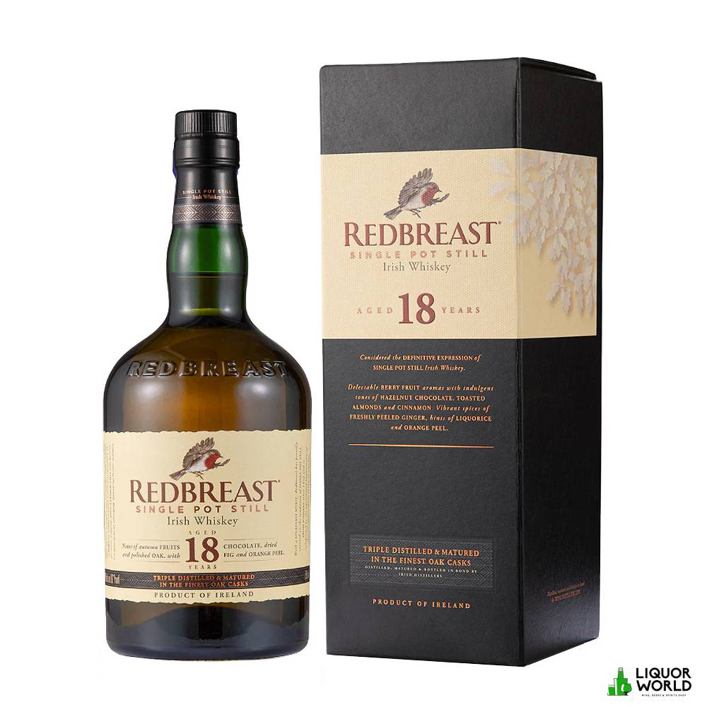 \nRedbreast 18 Year Old is a masterfully crafted Single Pot Still Irish whiskey that exemplifies the richness and complexity of Ireland’s whiskey-making tradition. Matured in a careful balance of first-fill American oak bourbon barrels and Spanish Oloroso sherry butts, this 18-year-old expression offers unparalleled depth and refinement. Bottled at 46% ABV, non-chill filtered, and full of luxurious character, Redbreast 18 is revered by connoisseurs worldwide for its complexity, structure, and elegance.