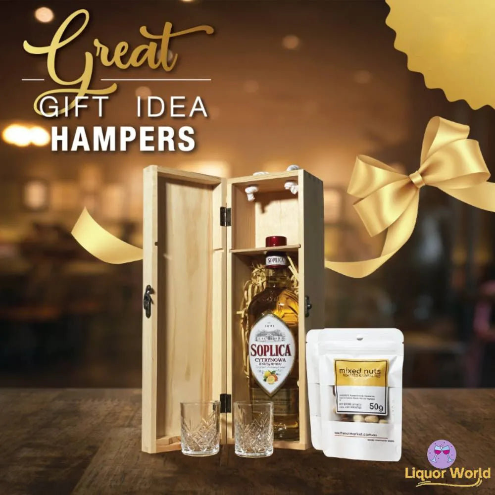 Soplica Polish Vodka Liqueur 500ml + Gift Hamper 1 x Soplica Vodka (500ml / 30%Alcohol) flavour of Choice 2 x Drinking Glasses 1 x Mixed Nuts 1 x Wooden Case This latest addition Single Soplica Polish Vodka Liqueur Gift Hamper includes one bottle of Soplica of your choice from the following six flavours: as well as two drinking glasses and a packet of mixed nuts, all presented in a beautiful wooden case. The perfect gift for any special occasion.